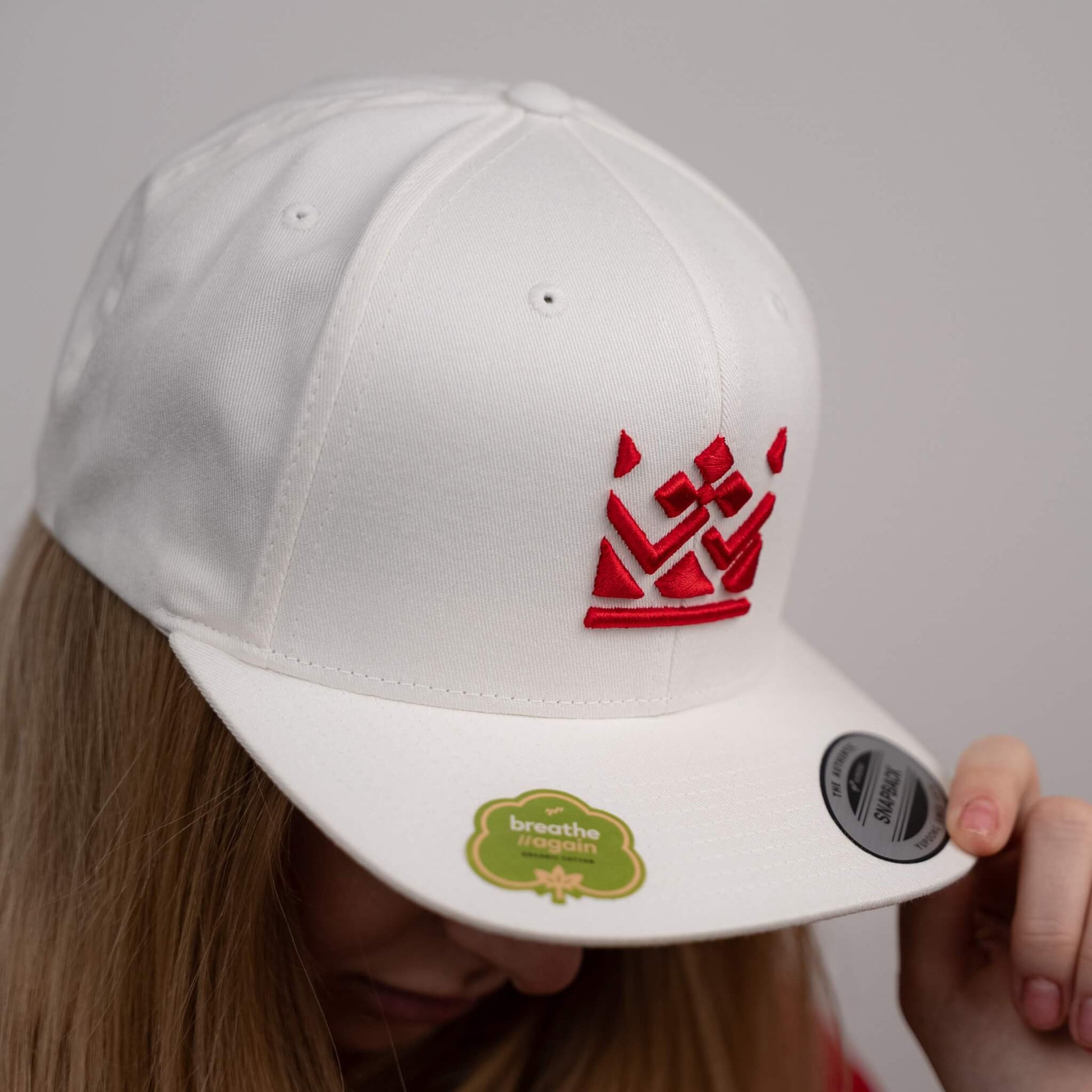 Minimalistická bílá kšiltovka s výraznou červenou výšivkou spojuje jednoduchý design se silným významem. V přední části dominuje stylizovaná korunka – symbol sebevědomí, odpovědnosti a přirozeného leadershipu.